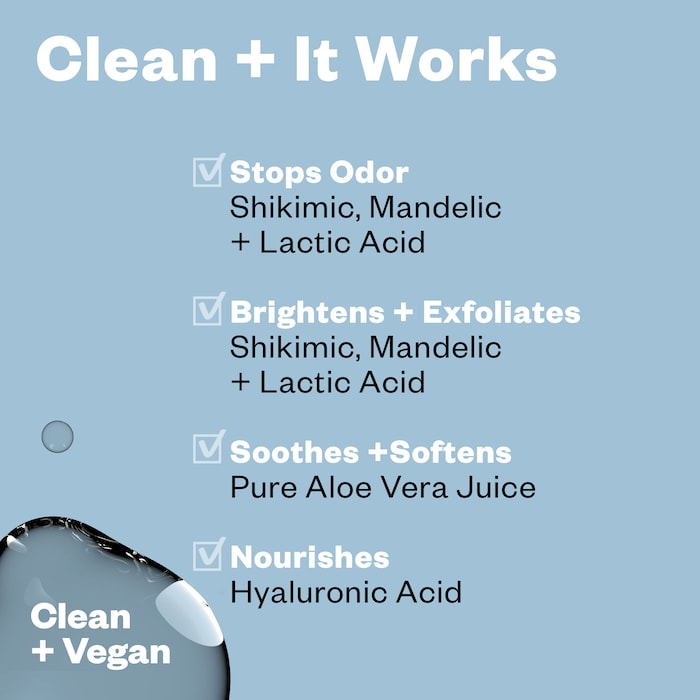 Un desodorante limpio que no deja manchas que presenta una mezcla única de AHA para una fórmula definitiva para combatir los olores. Disponible en Serene Clean (notas de cítricos, ylang ylang), Beachy Clean (notas de jazmín, sándalo, vainilla) y Fragrance Free.